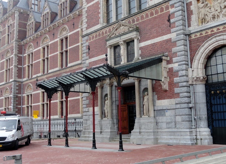 Als we het Vondelpark doorgereden zijn is het niet ver meer naar het Rijksmuseum. Het fietspad onder het museum door is nog niet opengesteld. Overigens zijn alle ingangen aan het zicht onttrokken door verplaatsbare hekken voorzien van wit zeildoek. Je ziet geen drommen kijkers. Dat is waarschijnlijk ook de bedoeling. Pas a.s. zaterdag gaat het museum weer open.