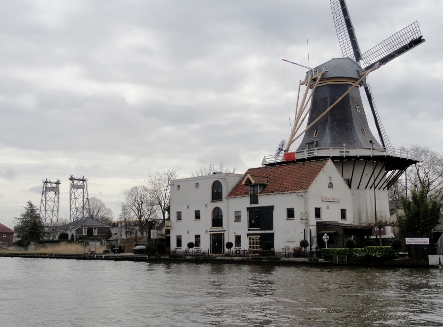 Aan de Vliet in Leidschendam moeten we wachten omdat de brug open staat om een paar schepen de sluis in te laten varen. Aan de andere kant van de rivier hebben we uitzicht op een zaagmolen. Een groot stuk fietsen we over een fietspad door de Vlietlanden. In Leiden volgen we het Rijn-Schiekanaal tot de watertoren bij de weg naar Leiderdorp.