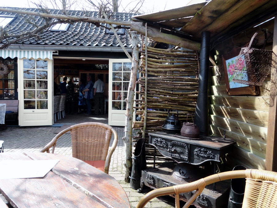 De polders tussen de Eem en Eemnes zijn voor ons onbekend gebied. We gaan over een zelfbedieningspontje en ploffen neer bij Theetuin Eemnes. Een oudere man die langs ons tafeltje komt, zegt: ‘Jullie hebben de beste plek in de theetuin’. Dat vinden wij ook. Helemaal beschut en de zon in het gezicht. Ik moet uitkijken dat m’n Gerardus kloosterbiertje niet verdampt.