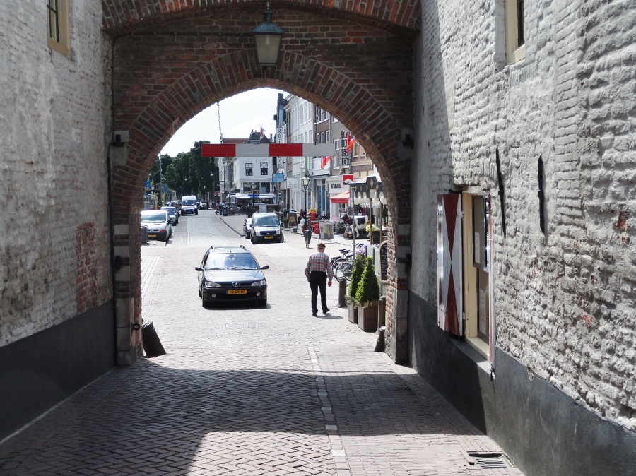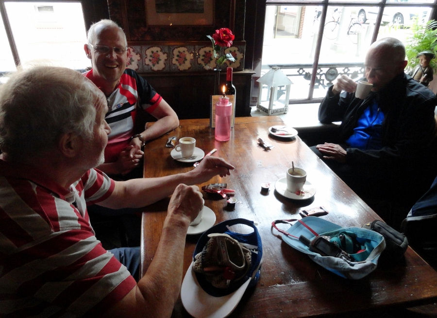 Rond half twaalf zitten we aan de koffie op het terras van Stadscafé aan de Markt van Zaltbommel, nadat de NS ons met de fietsen in deze stad heeft gebracht.
