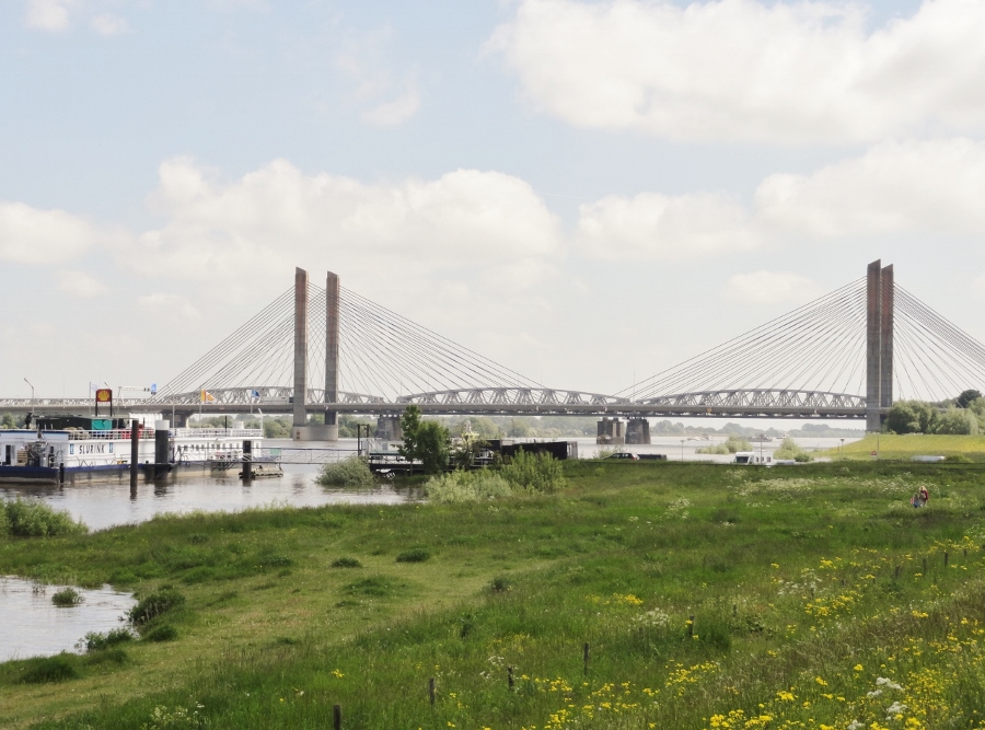 Later op de middag gaan we, om weer aan de noordkant van de Waal te komen, met een paar lussen over de brug tussen de snelwegknooppunten Ewijk en Valburg. Er wordt aan deze brug geklust. Daarom rijden aan één kant geen auto’s. Een stukje verderop zien we dat het voetveer tussen Slijk-Ewijk en Beuningen uit de vaart is. We hebben deze oversteek niet nodig.