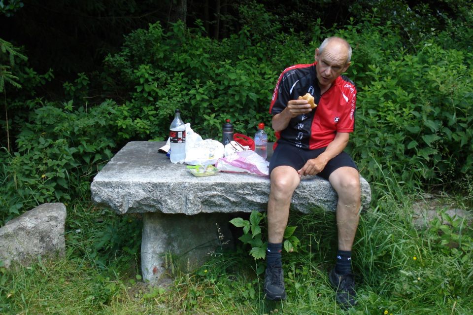 Dat gaat voor het grootste deel geleidelijk omhoog en is daarom redelijk te doen. Twee km vóór Bischofsgrün, het is inmiddels na 12.00 uur, vinden we een stenen tafel met stenen banken. Er is lang niet gemaaid op deze plek. Struiken en brandnetels groeien deels tegen het degelijke meubelstuk.