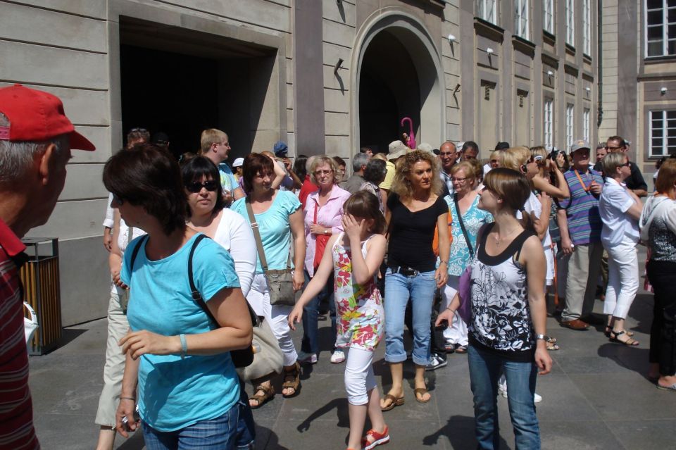 Na een ontbijtje op de camping gaan we op de fiets met bepakking naar de burcht van Praag. De fiets laten we aan de voet van de trappen staan in een miniparkje tegen een zitbank in de schaduw. Een politieagent heeft vlak bij onze fiets een staanplaats ingenomen. Er is veel blauw op straat in Praag. Omdat het zo warm is, lopen ze weinig maar blijven lang op één plek staan in de schaduw.