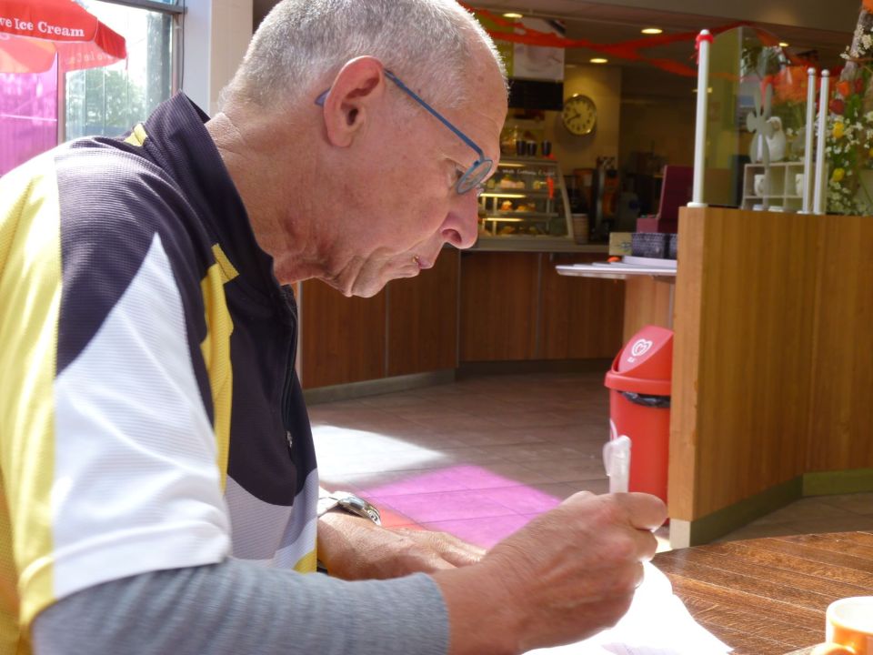 Bij Intratuin in Loosdrecht gaat we voor de koffie. Als we onze tweede bak koffie nemen klettert de regen hard op het glazen dak en de glazen wanden van de koffiebar. Weer eens wat anders, een koffiebar in een plantenkas. We hebben de afgelopen jaren tijdens fietstochten al op allerlei plaatsen koffie gedronken, zoals bij een verpleeghuis, een dierenasiel en bij een koffiehuis gerund door mensen met een verstandelijke beperking.