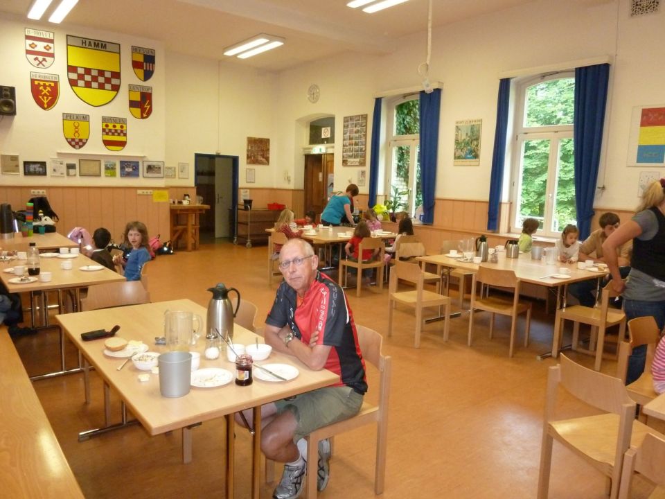 Er is voor ons bij het ontbijt een aparte tafel gereserveerd in de jeugdherberg. Naast ons zijn er ongeveer 25 kinderen van ongeveer 7 jaar met drie juffen en een meester. Het scherpe mes om broodjes door te snijden is boven op een hoge kast gelegd om de tere handjes van de kinderen te beschermen. Als ik voor de tweede keer brood ga halen in de zijkamer, waar de ontbijtspullen staan uitgestald, vertrouwt een jongetje mij toe dat het meisje dat naast hem staat zijn vriendinnetje is, maar niet voor altijd, voor soms. De chocolade van het broodbeleg zit rond haar lippen.