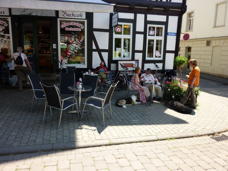 In Witzenhauzen doen we onze boodschappen bij de Aldi en de bakker aan de overkant. De fietsroute gaat door een tunneltje onder de drukke Dorpsstraat door. Allendorf heeft erg veel vakwerkhuizen. Hier doen we een bakkie bij een Konditorei, in de schaduw.