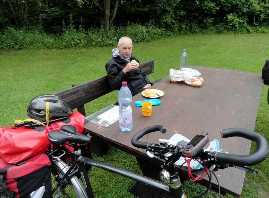 We ontbijten in de stad tegenover het raadhuis op een bankje voor de Franciscaner klooster. De broodjes en de plakken kaas kochten we in de stad bij de Lidl. Daarvoor gaan we een stukje terug op de route.