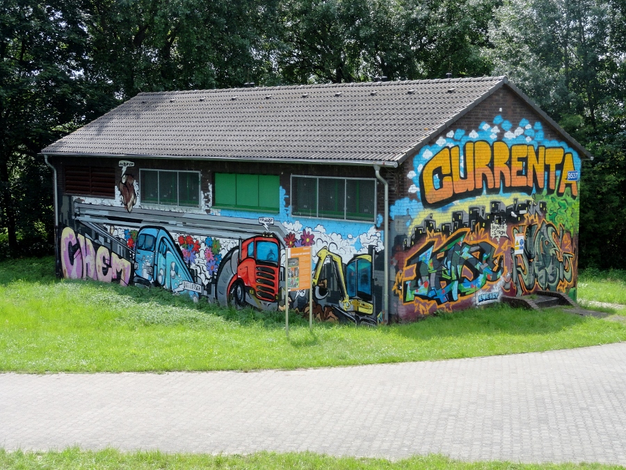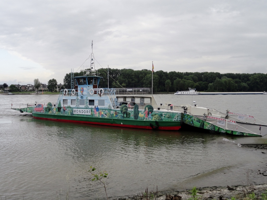 In de Biergarten van een klein café-restaurant nemen we om 15:15 uur onze middagthee. Straks kunnen we kiezen voor de drukke westkant of de rustige oostkant van de rivier. Wij gaan voor de tweede optie. Aan die andere kant van de drukke brug naar Düsseldorf zijn veel potplantenkwekerijen. Dan volgt een dorpje met de naam Hamm. Na het passeren van de binnenhaven en een golfterrein komen we nog in een randje van het stadscentrum van Düsseldorf. Hier steken we twee bruggen over om weer aan de westkant te komen.