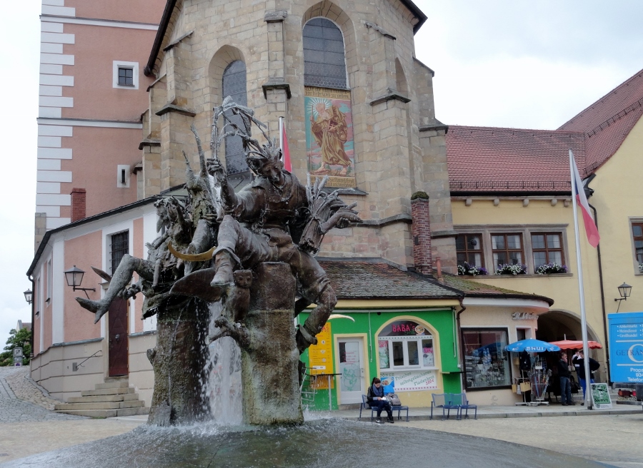 Dobřany heeft een heel mooi marktplein in haar centrum. Er staan geen terrassen. Misschien nooit of vandaag niet omdat het regent. Wij nemen om 10 uur een kop koffie in een koffiezaak/ijssalon/gebak- en chocoladewinkel.