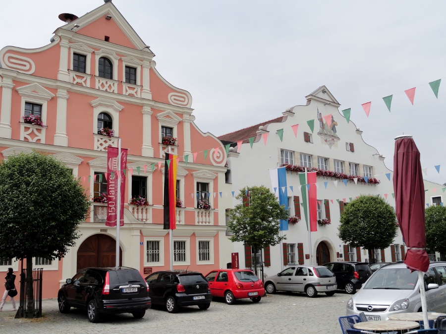 Wij fietsen in het dal van de Chambach. Cham is hier de belangrijkste plaats. Het is een mooie Beierse stad. Een herdenkingspaal van de gilden en schutterijen staat op het marktplein. We maken een praatje met een Duits echtpaar. De man maakte ook diverse meerdaagse fietstochten door Duitsland.