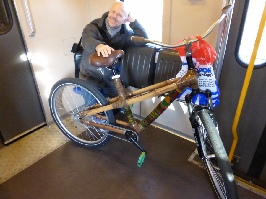 Door werkzaamheden aan het spoor rond Station Schiphol, zal vandaag niet alles volgens schema verlopen. Voor ons liep vanmorgen alles wel soepel. Het was een gezellige treinrit naar de beurs. Ook een fabrikant van bamboefietsen zat met een voorbeeld in de trein. Zijn frames worden gemaakt in Ghana en de fietsen worden gemonteerd in de sociale werkplaats van Amsterdam. Clemens Sweerman, de auteur van heel wat fietsrouteboeken reisde ook met ons op.