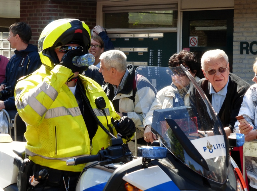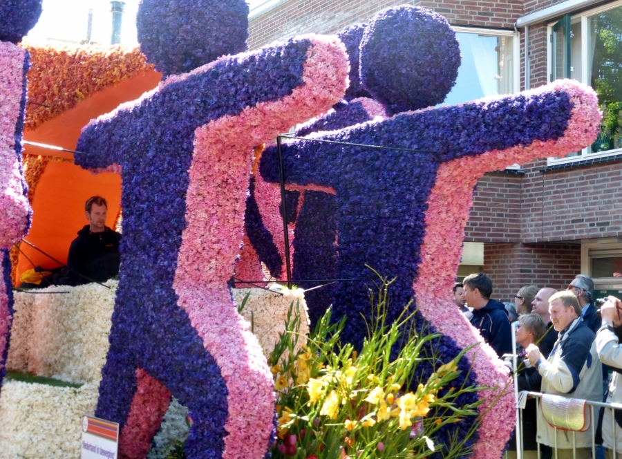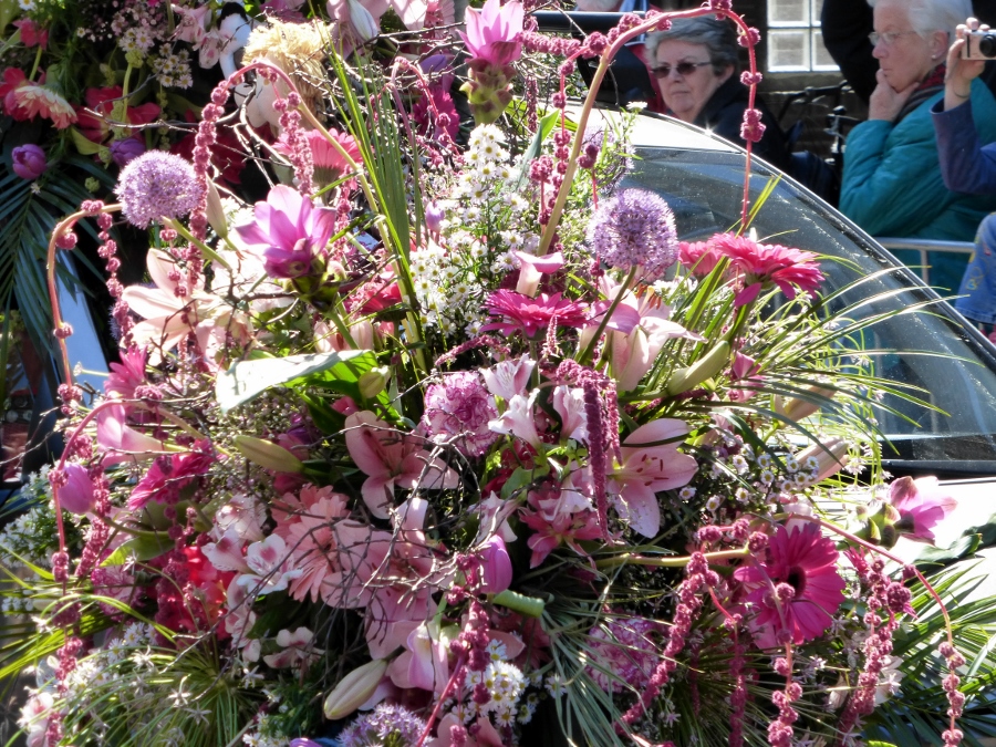 Na een lunch op een terras aan de Nieuwe Rijn, met uitzicht op de Visbrug en V&D, het warenhuis dat op deze Leidse feestdag gesloten is, gaan we naar de Breestraat, waar de jaarlijkse optocht wordt gehouden. Het is een soort bloemencorso maar dan zonder met bloemen versierde auto’s. Er komen onder andere muziekkorpsen voorbij en verklede burgers.