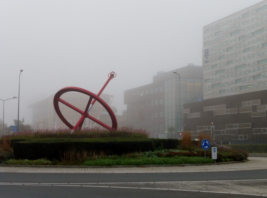 Bij Station Mediapark steken we de drukke weg over via een traverse. Aan de overkant gaan we via een stalen wenteltrap naar het fietspad. Hilversum is in nevelen gehuld. De straten zijn hier genoemd naar BN-ers van radio en tv, zoals familie De Mol en Mies Bouman.