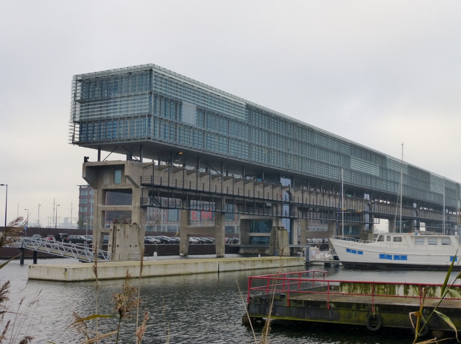 De middagpauze nemen we bij De Pont, een café-restaurant aan het IJ tegenover het Centraal Station. We wandelen door een woonwijk, waar in vroeger tijden de Amsterdamse Droogdokmaatschappij was gevestigd. De ramen van Café ’t Eitje zijn geblindeerd.