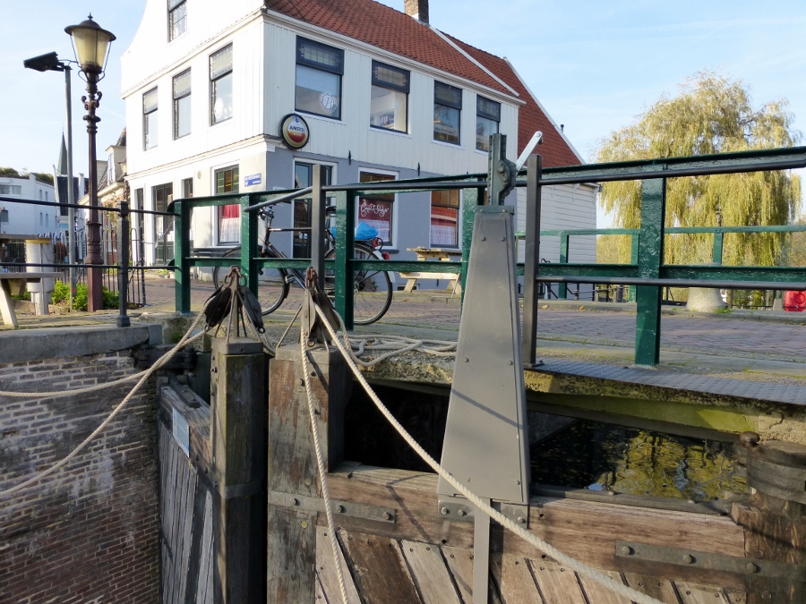 Bij Durgerdam hebben we uitzicht op het IJ. Er liggen woonboten in het water, sommige zien er erg luxe uit, andere soms wat rommelig. We gaan de Oranjesluizen over. Er kunnen geen auto’s over, ook fietsen mogen niet via de sluizen. Tot twee maal toe moeten we wachten bij een rood stoplicht omdat er sluisdeuren open staan. Al met al een leuke ervaring.