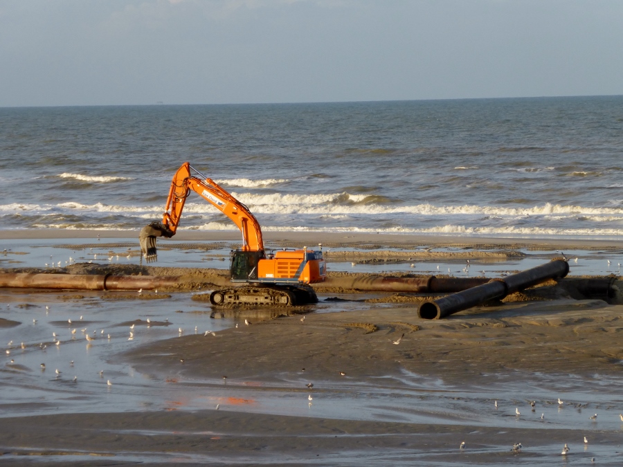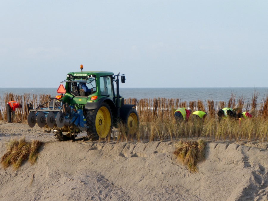 Alleen het eerste stuk hadden we nog vrij uitzicht op de kustlijn, verderop ligt al een duin van aangevoerd zand. Een groep Poolse werknemers plant riet om het zand te beschermen tegen de wind.