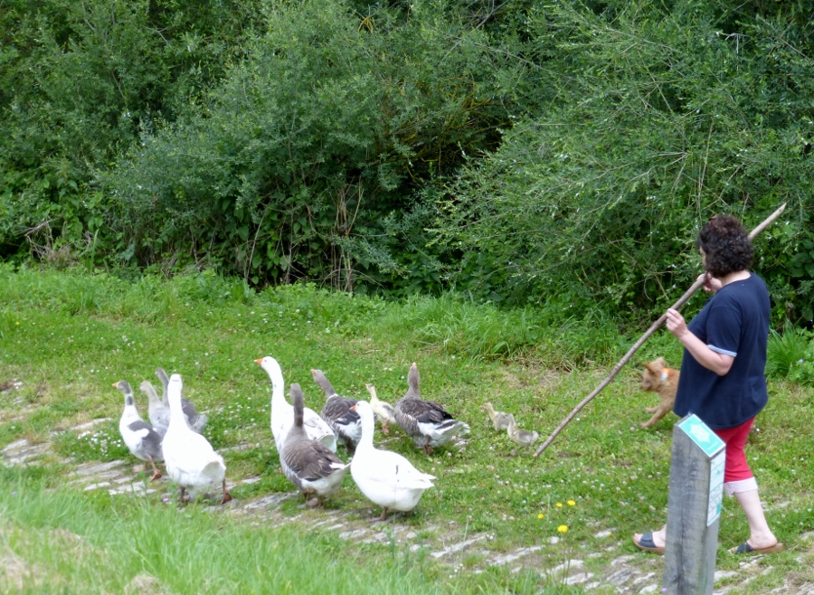 Het is stralend weer. Op ongeveer tien kilometer van onze start is een stadje waar we brood kopen voor ons middagmaal en een rondje lopen over de markt. Twee Franse dames en een heer die in hetzelfde hotel als wij verbleven komen we hier ook tegen. Zij gaan ook boodschappen doen.