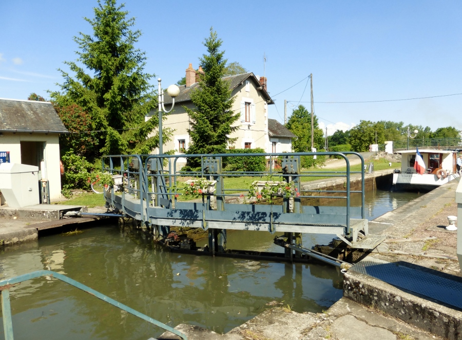 Omdat we naar La Bussiëre willen, dat van de Loire af ligt, moeten we nu de stad uitklimmen. Daarna volgt een heuvellandschap door Les Grandes Bois. Als we na 30 kilometer weer in het dal zijn, fietsen we langs een kanaal. Het doet me denken aan twee jaar geleden, toen ik een rondje Bourgondië fietste. Ik zag toen ook veel kanalen en nog meer sluizen.