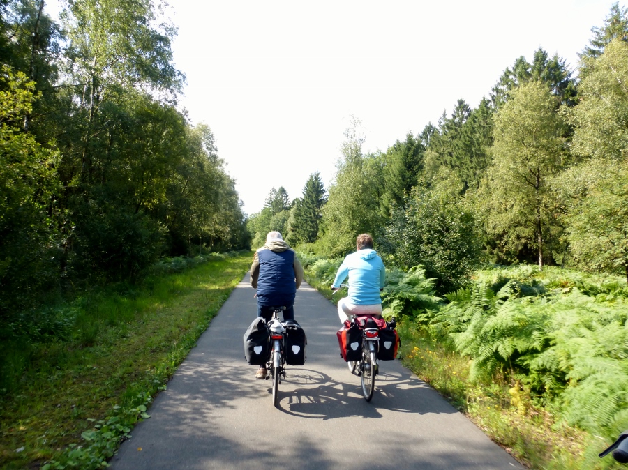 We hadden het plan om volgens de route van een Rondje Oost-België door het hart van het beschermd natuurgebied De Hoge Venen naar Aken te fietsen. Mede omdat de weersverwachting voor vandaag niet zo gunstig is, nemen we de makkelijke variant over de Vennbahn langs Monschau. Deze weg reden we ook op dag 1 en dag 2, maar nu dus van zuid naar noord.