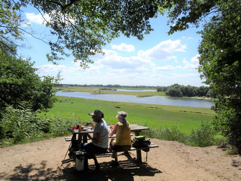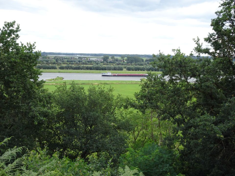 Evenwijdig gaat het langs de Nederrijn. Bij Opheusden gaan we met het pont over. De bootsman met nog maar alleen twee fietsers aan bord wacht op ons. Hij zag ons aankomen lopen. Nu zijn we op de Grebbedijk niet ver weg van Ouwehands Dierenpark en de erebegraafplaats van de omgekomen Nederlandse soldaten bij de slag op de Grebbeberg van mei 1940. Wij gaan echter de andere kant op over de Afweg, een erg stille weg. Bij het Nudepark komen we uit. Dat klinkt mooi. Het is een industriegebied met onder meer opslaggebouwen voor veevoer. Vrachtwagens rijden af en aan. Hier is ook geen fiets- of voetpad. Bepaald niet het mooiste stukje Wageningen.