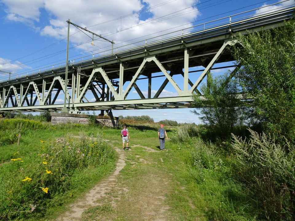 We steken de Mandelabrug over. Aan de andere kant van de Rijn gaan we voor onze eerste bak koffie, voordat we het natuurgebied Meinerswijk ingaan. We lopen op een gegeven moment over een lange brug waar in de oude tijd trolleys reden met klei voor een steenfabriek. ‘Wilde’ paarden schuilen hieronder tegen de warme zonnestralen.