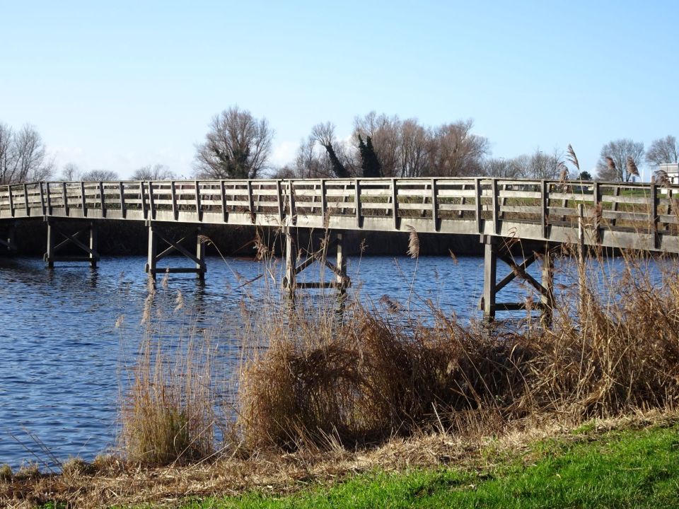 Niet ver van het gemaal aan de rand van een bos met uitzicht op een kanaal met een houten fiets- en voetgangersbrug staat een bank in de zon en uit de wind. Een uitstekende plek voor een rustmomentje met mijn boterhammen en mijn dopper met karnemelk.