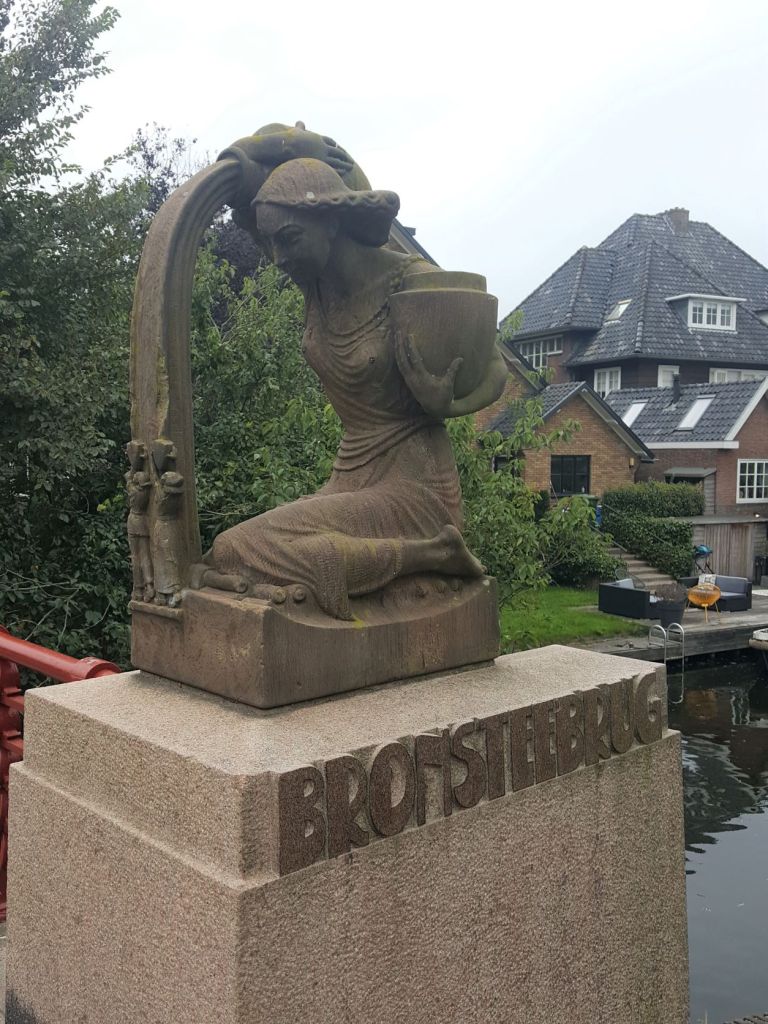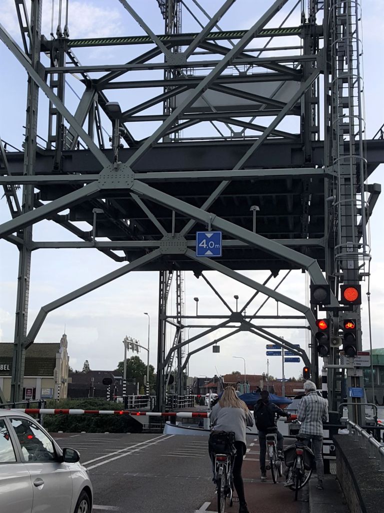 Er wordt onderhoud gepleegd aan de hefbrug van Alphen aan den Rijn. Dit houdt in dat ik moet omrijden. Het is voor mij een zoekplaatje. Na hier en daar wat vragen kom ik uit bij een fietsbrug zo’n tweeënhalve kilometer verder op. Ik rijd vandaar weer naar de hefbrug.