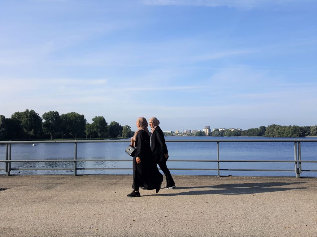 In Leiden moeten we omrijden in verband met werkzaamheden aan een kruising en omgeving. Verschillende fietsers gaan toch verder over het met schrikhekken afgezette fietspad. Wij proberen het ook maar. Een stuk verder kunnen we alleen nog maar over het pleintje van een moskee. Vandaar is het nog maar een klein stuk omrijden.