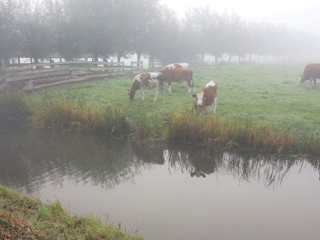De dag zou beginnen met mist. Op Buienradar zag ik gisterenavond dat het vandaag al om 8.00 uur zonnig zou moeten zijn. Als ik om kwart over acht van huis ga is het nog mistig in de polder tussen Lisse en Warmond.
