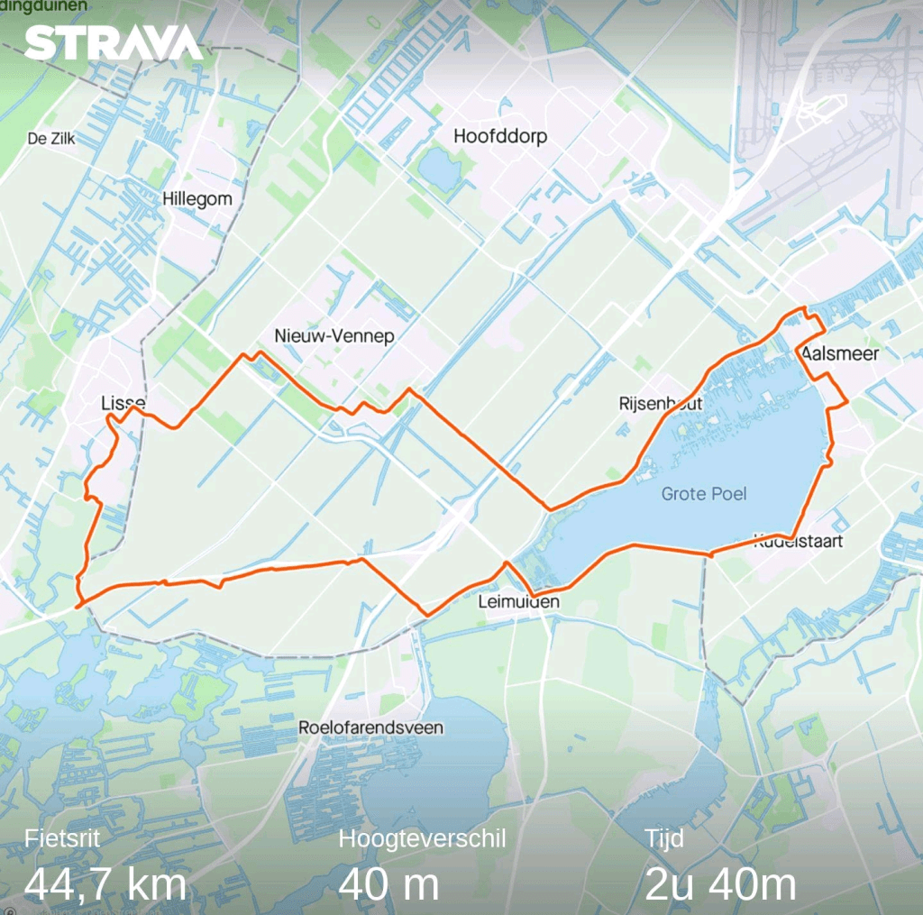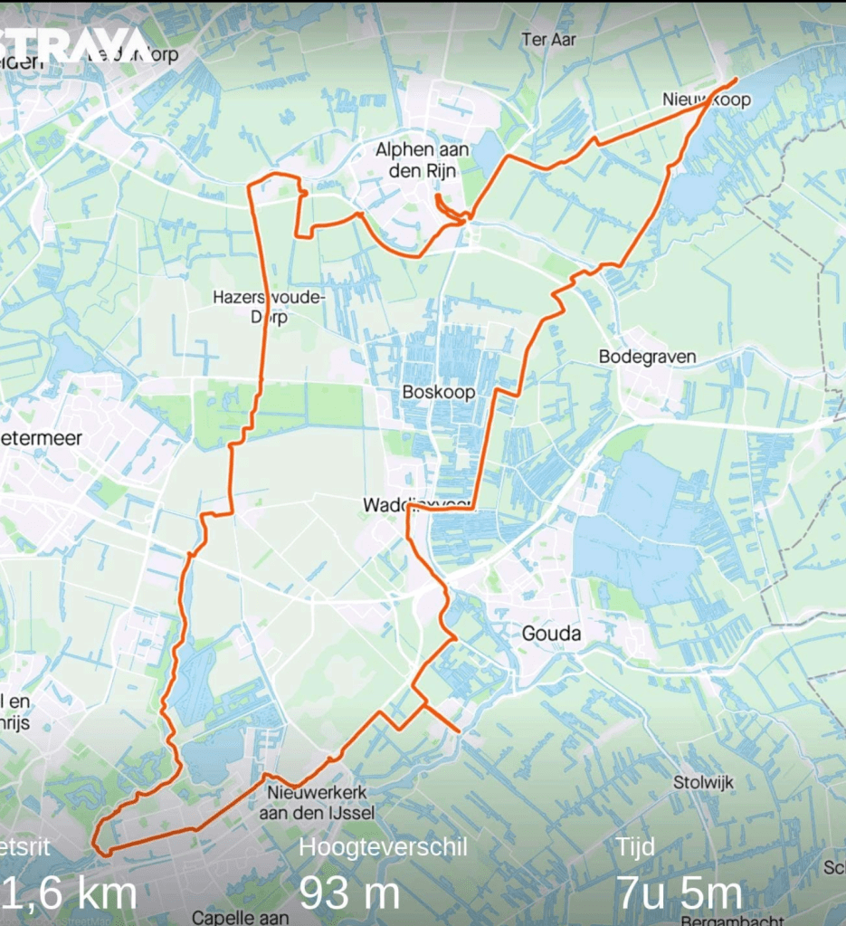 Een rondje fietsen vanaf Nieuwkoop, 91 km. Zwammerdam, Boskoop, Waddinxveen, een puntje Gouda, Moordrecht, Nieuwerkerk aan den IJssel, Rotterdam Ommoord en Terbregge, langs de Rotte, Oud Verlaat, Moerkapelle, Bentwoud, Hazerswoude, Alphen aan den Rijn, Aarlanderveen.