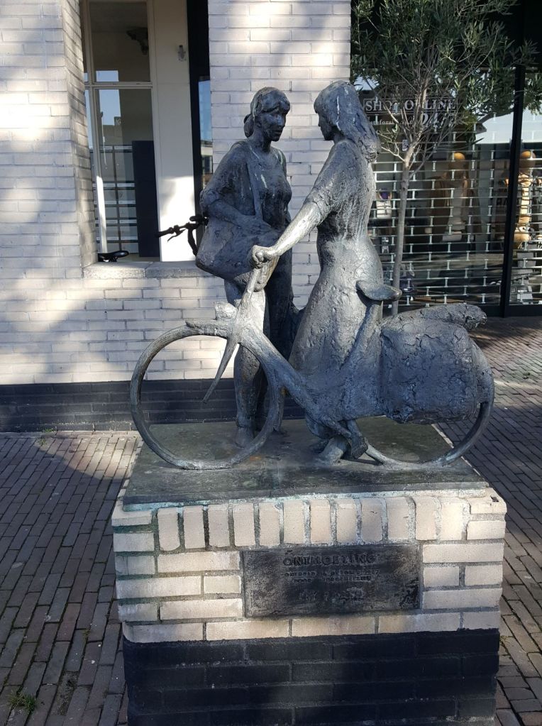 Op een smal pad dwars door de weilanden rijden we naar Benthuizen. Margo en ik willen in dat dorp een kop koffie scoren in een café of koffiezaakje. Benthuizen is maar een dorpje. Op het fietspad loopt een man met een hond. Ik vraag hem of we in Benthuizen ergens koffie kunnen drinken. Hij vertelt waar het ‘winkelcentrum’ is. Bij de fietswinkel aan de Dorpsstraat een zijstraat in. ‘Ik hoop dat het open is’, zegt hij nog. Er is een pleintje met een PLUS-markt en een cafetaria. Die laatste is nu dicht. Daarom drinken we onze koffie uit de thermosfles op een bank in het ‘winkelcentrum’.