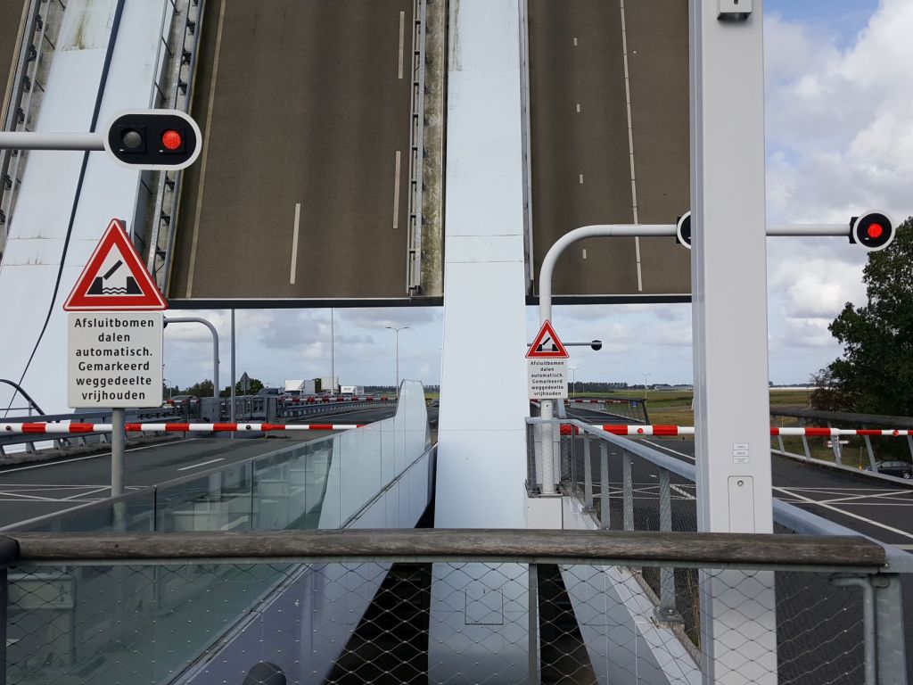Vandaag wil ik naar de sluizen van IJmuiden. Van mijn broer Johan had ik gehoord dat die al enige maanden weer open zijn voor fietsers. Als ik hier ergens een foto wil maken hoor ik het geluid dat hoort bij het dichtgaan van slagbomen. Ik maak geen foto maar maak dat ik weg kom. Kort na mij komt er een bromfietsers aan die zeer waarschijnlijk door rood is gereden. De slagbomen achter mij zijn inmiddels dicht. Hij moet voor de slagbomen wachten, terwijl twee meter achter hem de brug opengaat. Het is niet gevaarlijk maar misschien wel een beetje eng.