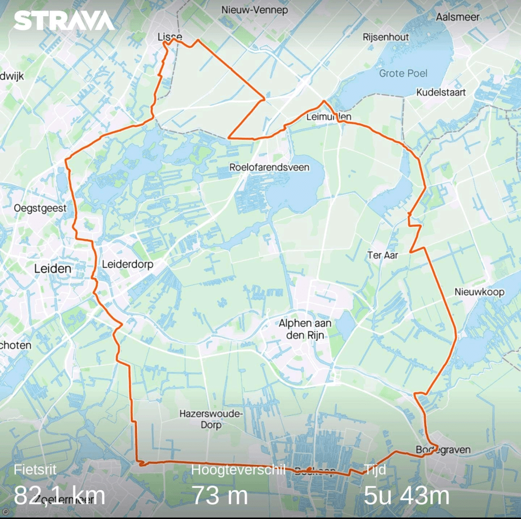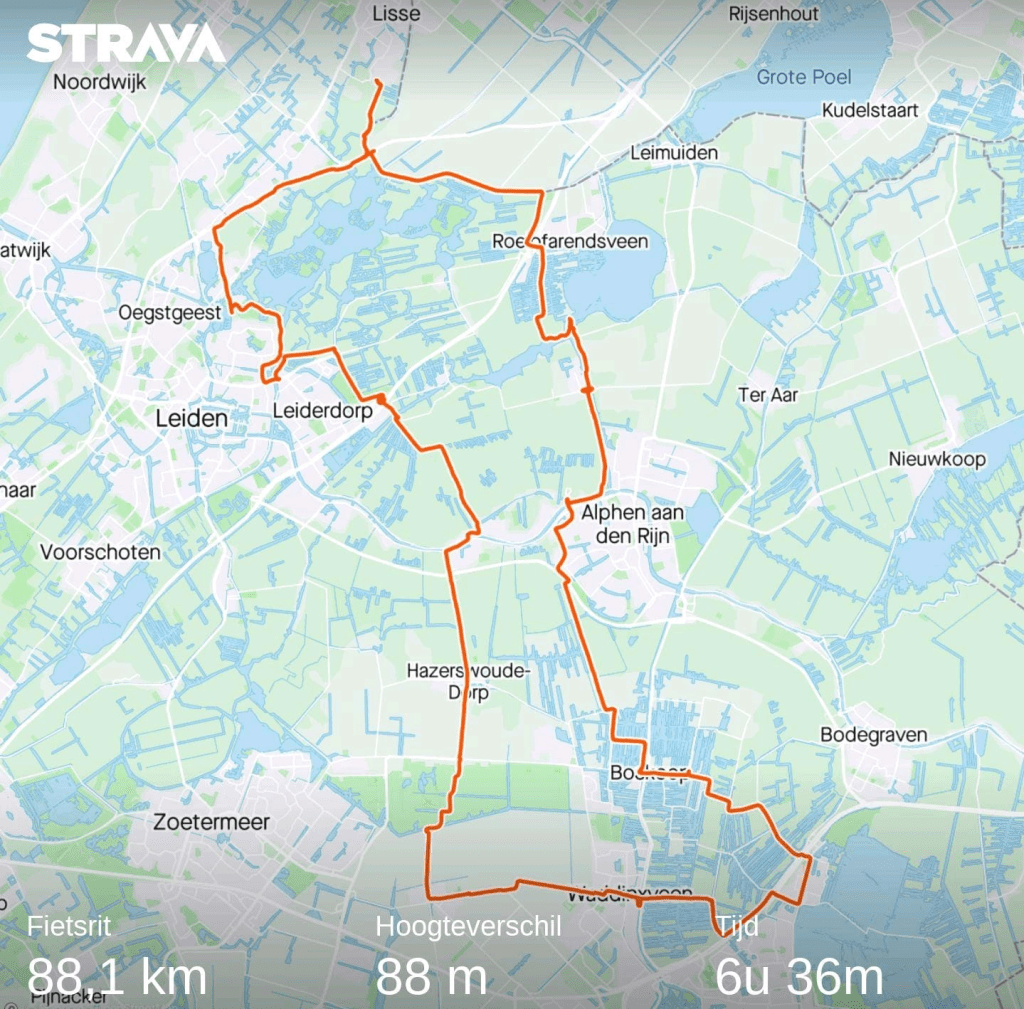 Fietsen: Lisse, Warmond, Leiderdorp, Koudekerk aan den Rijn, Hazerswoude Rijndijk, Hazerswoude Dorp, Bentwoud, Moerkapelle, Waddinxveen, Reeuwijk Dorp, Reeuwijk Brug, Tempel, Boskoop, Alphen aan den Rijn, Roelofarendsveen, Nieuwe Wetering, Buitenkaag. 88 km.