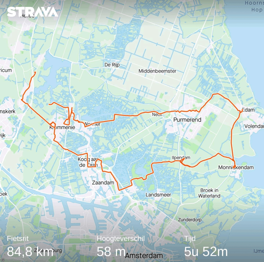 Rondje fietsen vanaf Akersloot met broer Bert. Akersloot, Uitgeest, Krommeniedijk, Assendelft, West-Knollendam, Molletjesveer, Wormer, Jisp, Neck, Purmerend, Edam, Monnickendam, Ilpendam, Den Ilp, Het Twiske, Oostzaan, Zaandam Peldersveld, Jagersveld, (Oud) Koog aan de Zaan, Zaandijk, Assendelft, Krommenie, Uitgeest, Akersloot, 90 km.