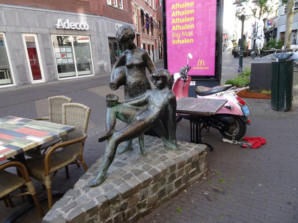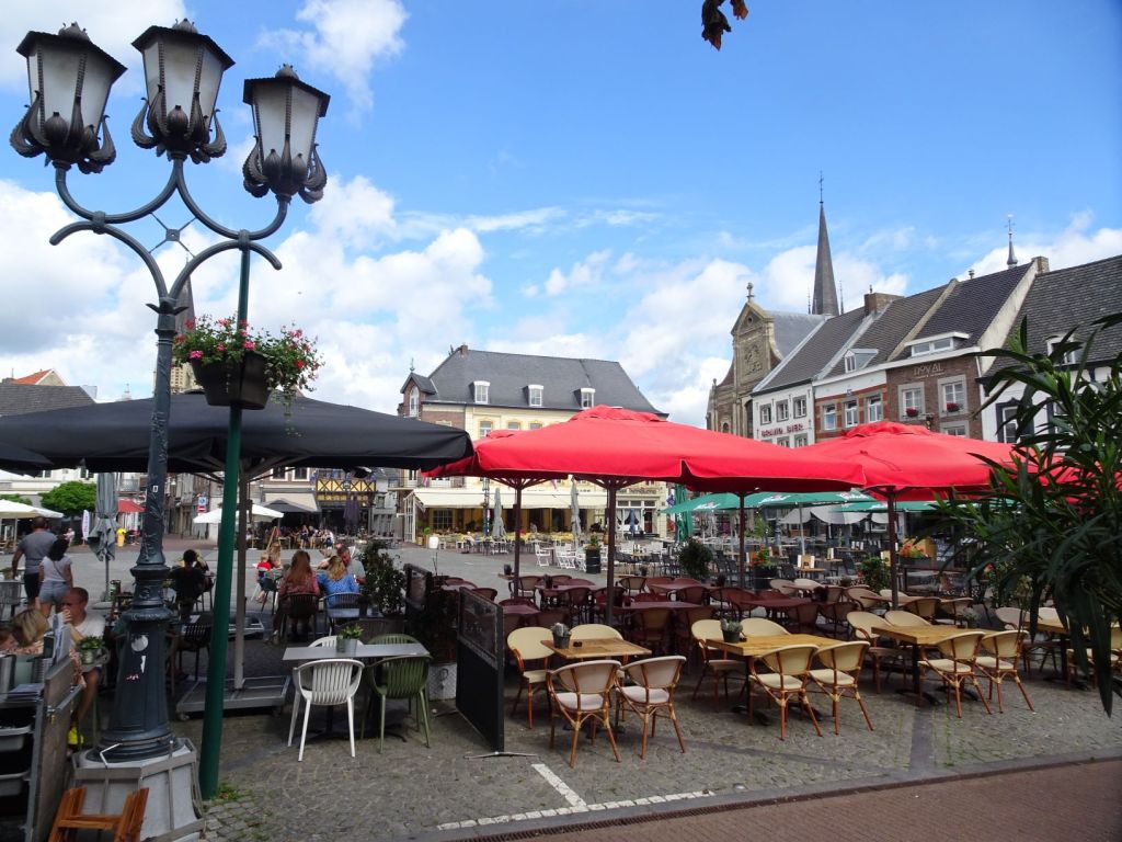 In Sittard nemen we plaats op een terras op de Grote Markt. Het is vandaag erg druk in verband met vaderdag. De vaderdag-ontbijten zijn hier erg populair. Het duurt daarom wat langer dan normaal totdat de lekkere hazelnootgebakjes vanuit de keuken bij ons worden opgediend. Geen probleem, we zitten hier prima in de schaduw. De felle zon schijnt aan de overkant van het grote plein op de terrassen.