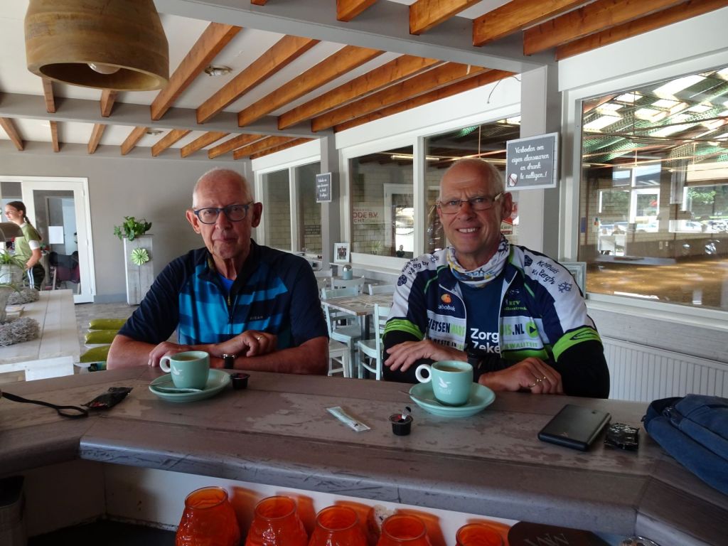 Als we in de kantine van een manege aan de koffie zitten vraagt een meneer van de organisatie of we onze fietsen een stukje verderop willen neerzetten. Ze willen niet dat er een pony tegen de fietsen aanloopt. Er is vandaag een of andere ponywedstrijd georganiseerd voor jonge kinderen.’ Het mag weer vanaf vandaag.’