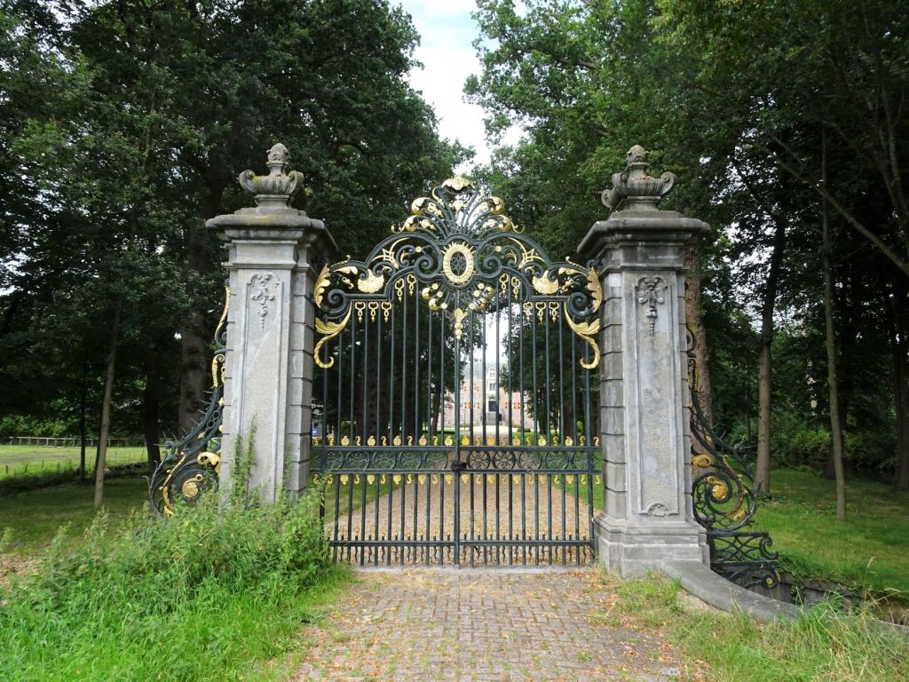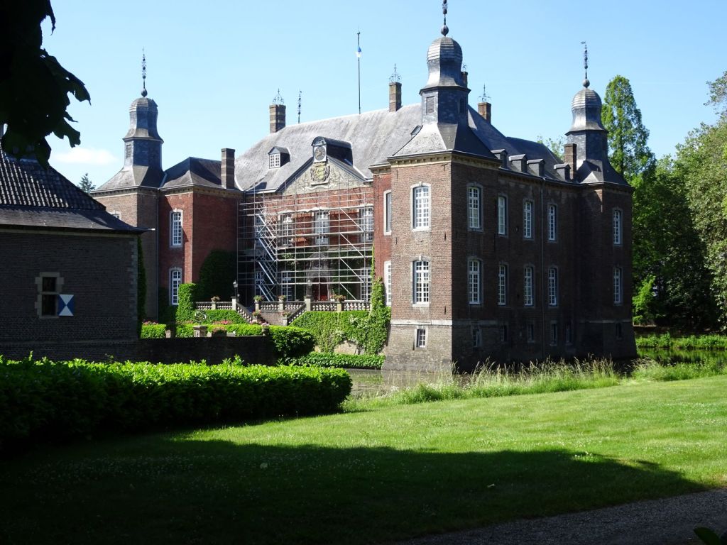 Bij Kasteel Hillenraedt in Swalmen maken we een praatje met een stel uit Hoofddorp. Zij lopen een aantal etappes van het Pieterpad voor wandelaars. Ze vertellen dat het erg moeilijk is om slaapplaatsen te vinden bij Vrienden-op-de-fiets, B&B’s en hotelletjes.