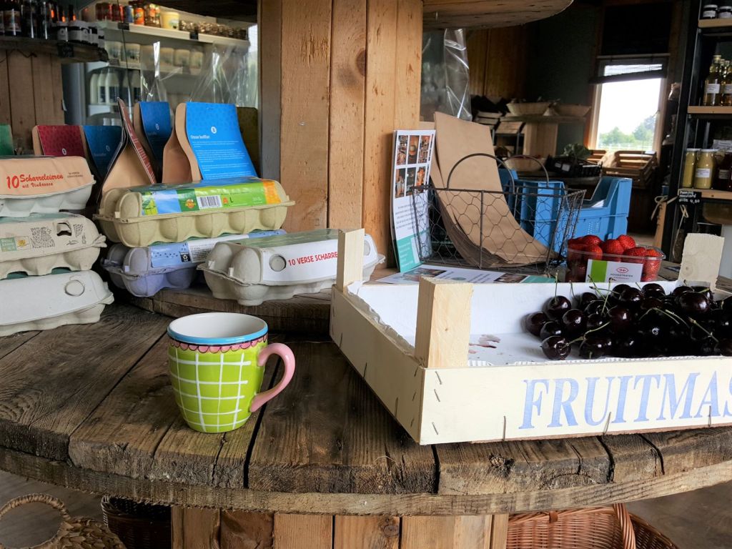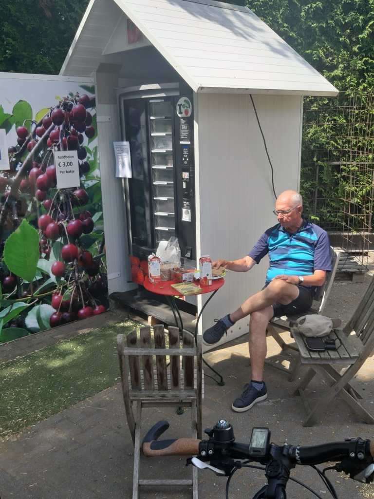 Sint Odiliënberg heeft een mooie basiliek met twee torens. Het volgende dorp is Montfort. Hier gebruiken we de lunch op een zitje bij de aardbeienautomaat van een kwekerij. De aardbeien komen van een Belgische collega-kweker. Over een week zitten er ook kersen in de automaat.