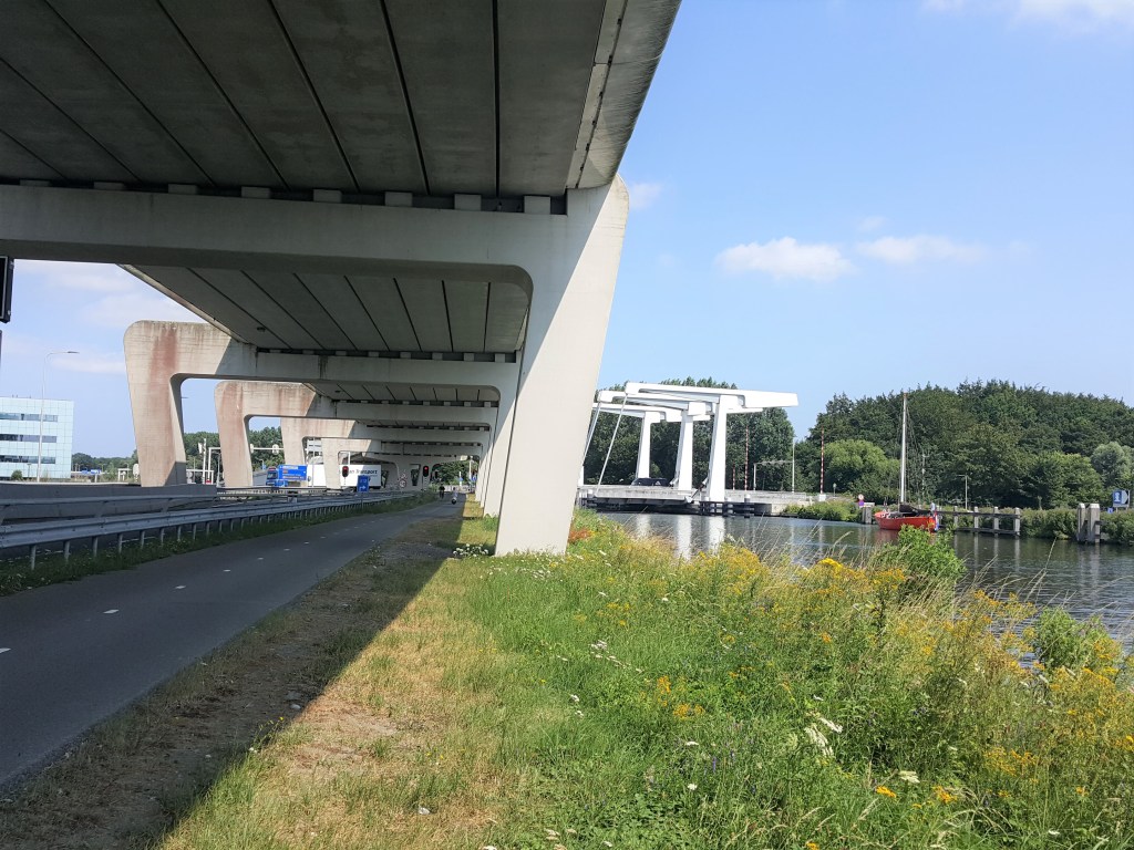 Tegen de klok in fiets ik de Kaagbrug over richting Buitenkaag. Ik passeer Gemaal Leeghwater. Een lange rij wachtende auto’s en fietsers staat bij het pont naar Kaagdorp. Voorbij het dorp Leimuiderbrug ligt aan de overkant van de Ringvaart een groot meer, de Westeinderplassen. Tussen het dorp Aalsmeerderbrug en Oude Meer is de ringdijk nu een fietspad tot aan Schiphol-Oost. Aan de andere kant van de ringvaart ligt het Amsterdamse Bos. Fietsers kunnen aan de binnenkant van de ringvaart een stukje de ringdijk niet volgen, maar moeten op een fietspad rijden langs een redelijk drukke weg met links en rechts kantoren, die allemaal iets van doen hebben met Schiphol. Al snel fiets ik weer op de dijk. Veel terrassen langs de ringvaart zijn druk bezet.