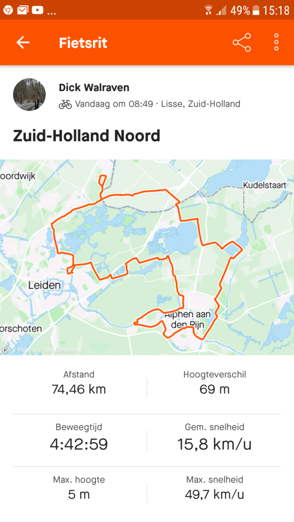 Rondje fietsen: Lisse, Warmond, Leiden, Voorschoten, Wassenaarseslag, Katwijk aan Zee, Noordwijk aan Zee, Lisse, 60 km.