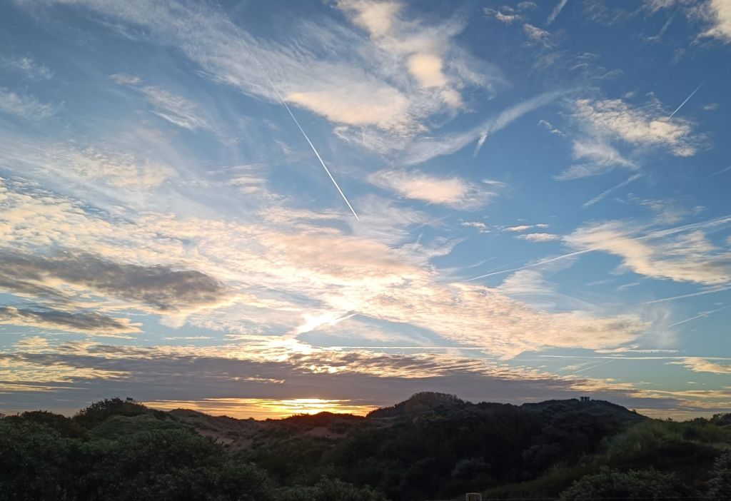 Eerst gaan we door de duinen over asfalt- en schelpenpaden naar de strandopgang Langevelderslag. Dat stuk loop ik op met een vrouw uit Bleiswijk. Zij logeert een paar dagen bij jachthaven Van de Meer aan het eind van de Derde Poellaan in Lisse.
