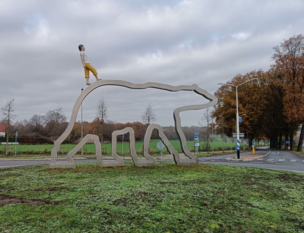 Als bus 5 ons heeft afgezet bij halte De Oude Molen begint onze wandeling. Eerst een stuk over de Oude Zevenheuvelenweg. Het landschap is behoorlijk glooiend. Bij een scherpe afslag naar links staat een schoolbord bij een huis met een verwijzing naar de wandelroute. Het lijkt alsof je over hun erf loopt. Met het opsteken van onze hand groeten we de bewoonster. Verder worden de dalen en de verhogingen intensiever.