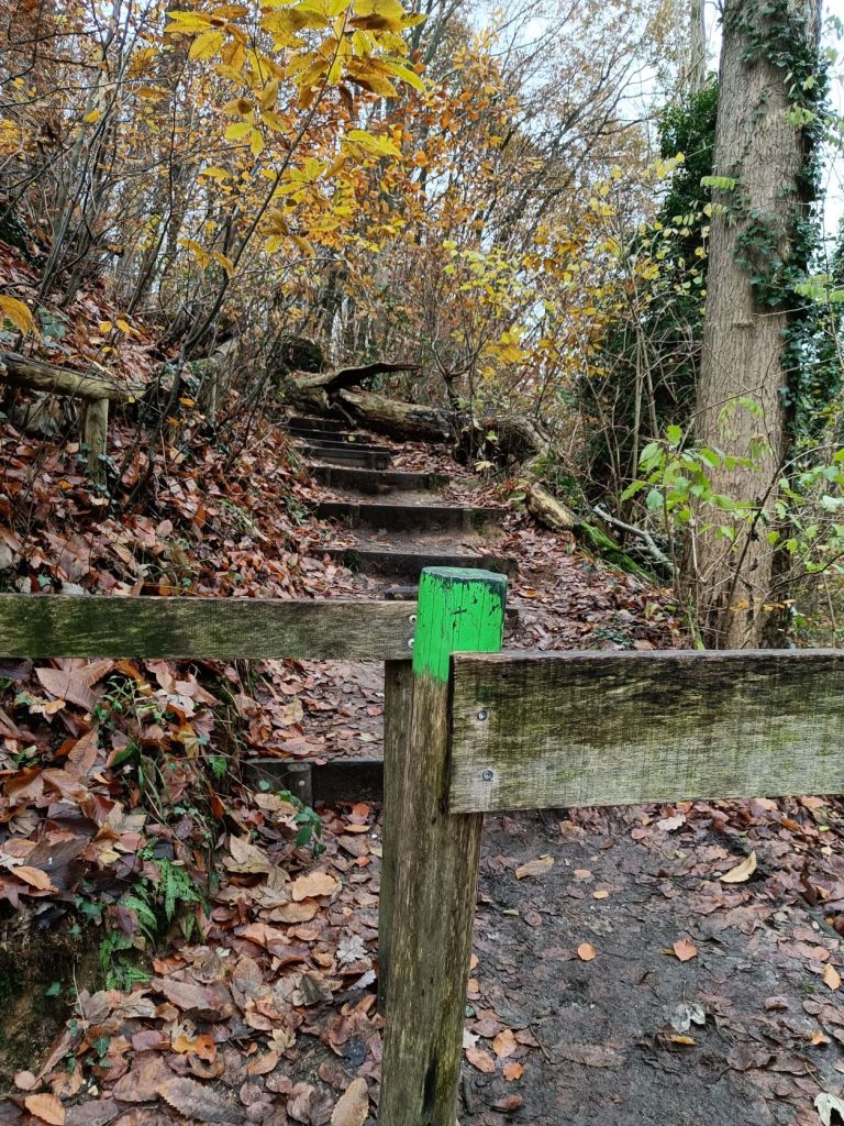 Hier in de buurt van de Duivelsberg is het slim op te letten op boomstronken die soms bijna aan het zicht zijn onttrokken door de afgevallen herfstbladeren. We lopen hier vooral door het bos. Soms gaan we hier weer naar beneden, de andere keer omhoog.