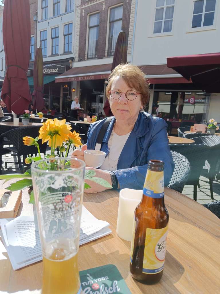 Vrijdag 7 juni 2024. Ik ben onderweg met het openbaar vervoer. Op Schiphol stapte ik over op de trein naar Amersfoort. Op Station Amsterdam-Zuid komt een vrouw tegenover mij zitten. Ze doet haar best om mij niet te laten merken dat ze moet puffen van haar spurt op het perron om deze trein nog te halen. Dat lukt haar niet erg. Op het volgende station, Duivendrecht, komt broer Leo de trein in. Die komt hier aan meet de trein vanuit de Zaanstreek. We gaan samen een wandeling maken in Amersfoort. In die stad aangekomen beginnen we met een kop koffie in de koffiebar van congrescentrum De Eenhoorn, tegenover het station.