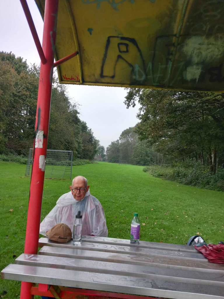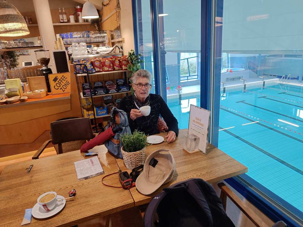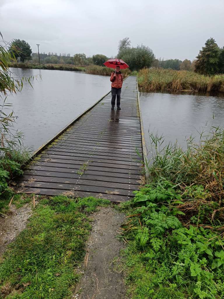 Nog maar even op weg komen we langs het zwembad. We gaan aan de koffie hier, hoewel het zwembad officieel gesloten is. Het is herfstvakantie en er wordt extra onderhoud gepleegd aan het bad. Margo voelt zich thuis bij een zwembad. Een aantal keren per week zwemt ze in het zwembad in haar dorp. Als we langs de Gein lopen is het eerst nog droog. Later komt de paraplu (van Margo) en de regencape (van mij) van pas. Het is mooi wandelen langs dit kronkelend riviertje. Bij Driemond lopen we eerst een stukje langs een drukke weg om verderop af te buigen naar een landelijk nu rustig fietspad.