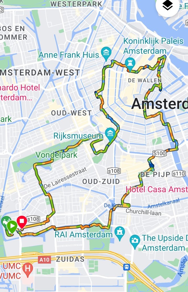 We komen langs veel bezienswaardigheden. Om er enkele te noemen: De Waag, de Schreierstoren, het Rijksmuseum, de Dam met het paleis, de Jordaan, het Vondelpark, het Amsterdams Lyceum en het Indië-monument.