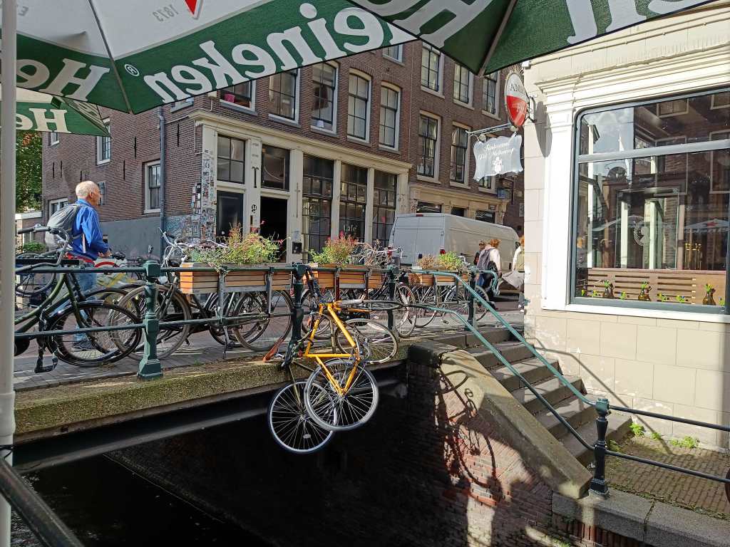 Onze recreatieve gpx-route voert vandaag nog even langs een aantal bezienswaardigheden in Gouda. Op deze droge dag gaan we vooral over landelijke fietspaden en stille wegen. Eerst na twee uur komen we langs een terras. Hier in het centrum van Alphen aan de Rijn zijn de cafés voor het uitzoeken. Wij gaan voor koffie en trakteren ons op appelgebak.