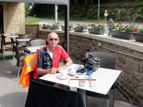 In Lierneux drink ik koffie in Café des Sports samen met vier Santiago-fietsers uit de gemeente Oost-Gelre (Groenlo). Eén van deze vier mensen kent mijn weblog, omdat ze dikwijls googelt naar reisverslagen op internet. Ze vindt het leuk om Dick Walraven nu eens in het echt te zien.