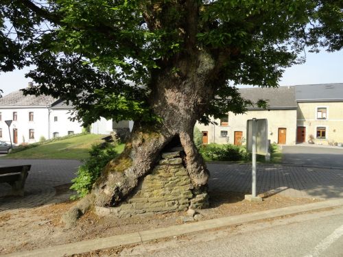 In Bastogne hebben ze een tank in het centrum staan. Hier in Cherain hebben ze een stuk geschut staan in het parkje ter ere van de omgekomen jongemannen in de eerste en tweede wereldoorlog. Een boom in dit parkje is om een muurtje heen gegroeid.