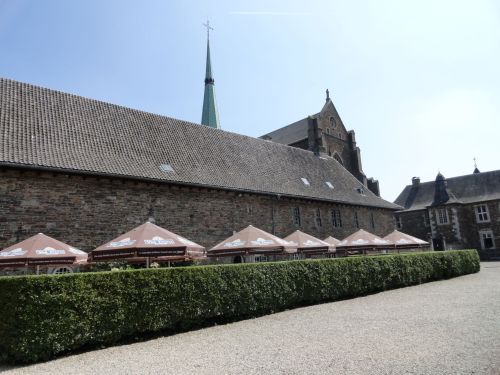 Toevallig kom ik later terecht bij de Abdij de Val-Dieu. Daar zou je zo voorbij rijden. Er hangen geen vlaggen of andere opzichtige aanduidingen. Het is een prima plek om even op te steken. De terrassen zijn gezellig. Er zitten allerlei Nederlanders, Belgen en Duitsers die op deze zonnige dag een stukje aan het rijden zijn met auto, motor, racefiets of fiets. Met een docent van Hogeschool Zuyd en zijn dochter heb ik een gezellig gesprek.